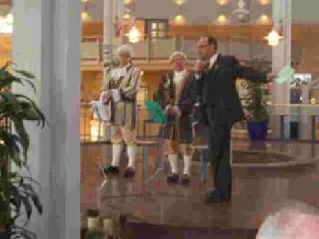 Blæsere i rokokodrageter spiller Bellmann på waldhorn