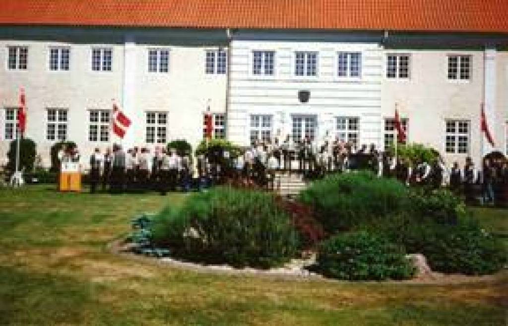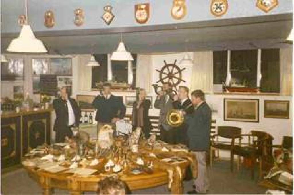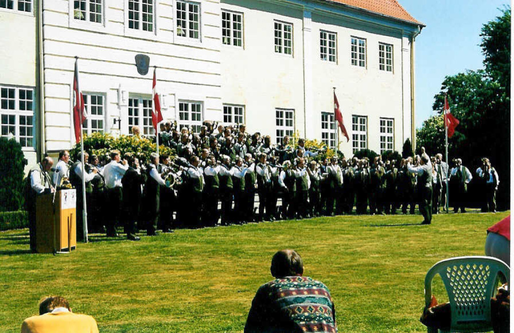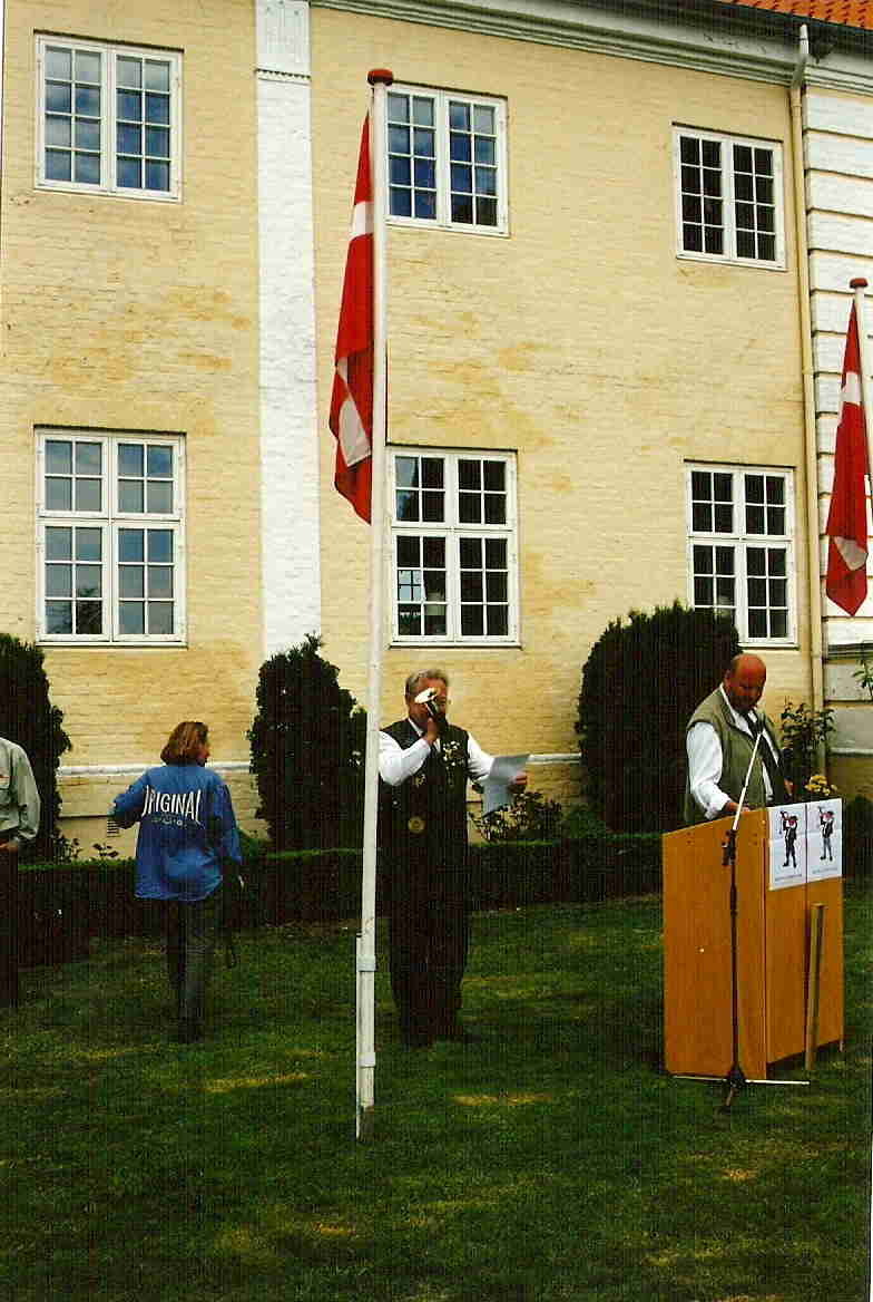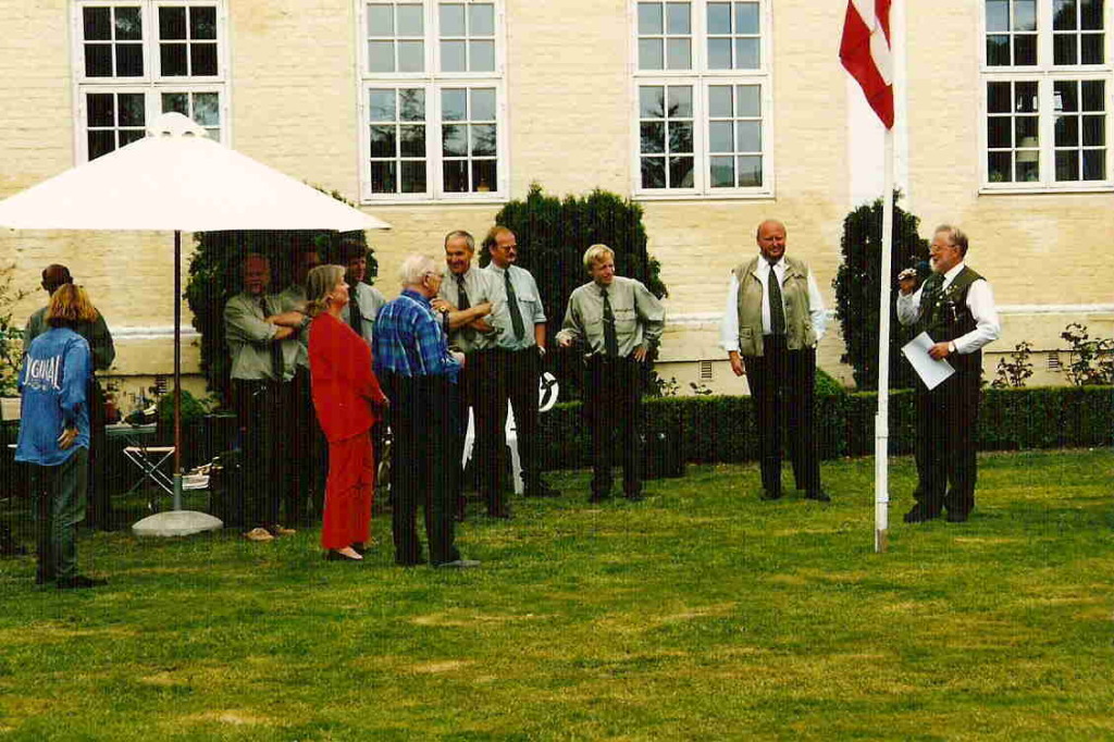 Dagen naturligvis som sig hør og bør med flaghejsning. – Jens Søndergaard blæste ”Honnør for Fanen”, medens flaget langsomt gled til tops på den høje flagstang. Og bagefter overbragte formanden for Jægerforbundets Jagthornsudvalg, hovedbestyrel- sesmedlem Tage Madsen, Jægerforbundets hilsen.