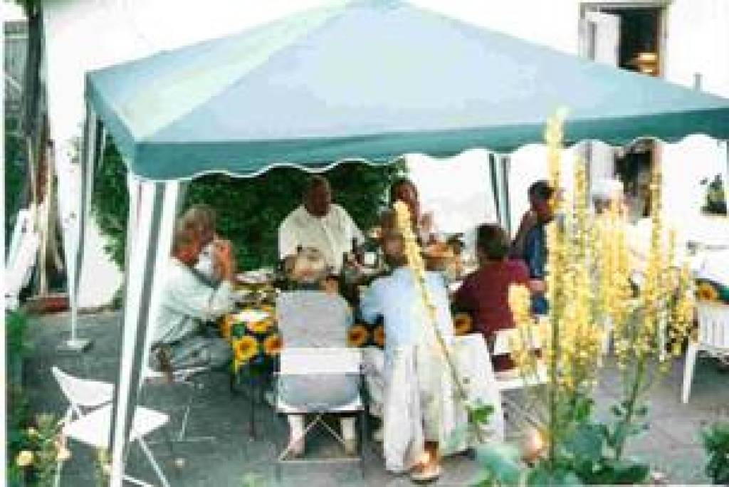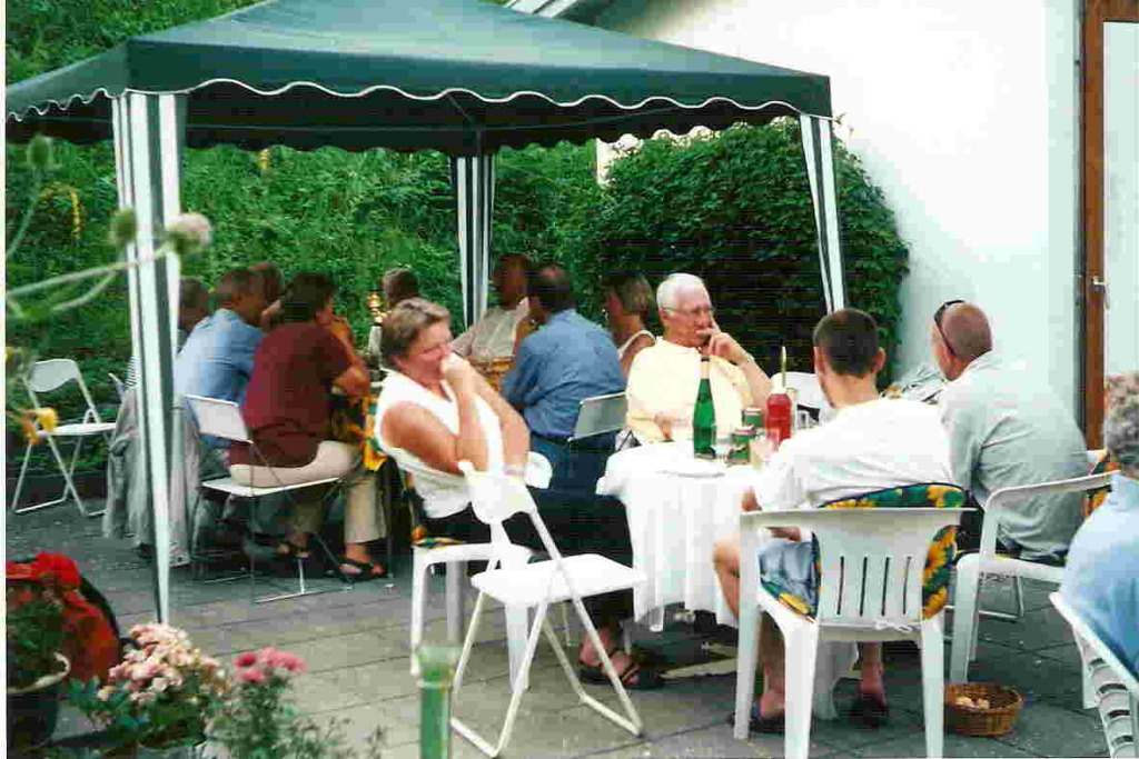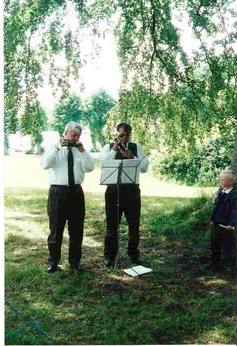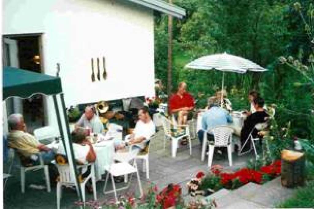 I modsætning til de fleste andre blæsergrupper, vi kender, blæser vi også ”igennem” om sommeren, selvom om skolen, hvor vi jo øver i musiklokalet, holder sommerlukket. - Vi mødes så på skift hos hinanden og har vores ”bedre halvdele” med. Vi blæser i haven og bliver efterfølgende trakteret med kaffe m.v..- Her er vi til grill-aften i Femmøller den 7. august 2002.