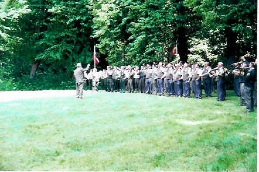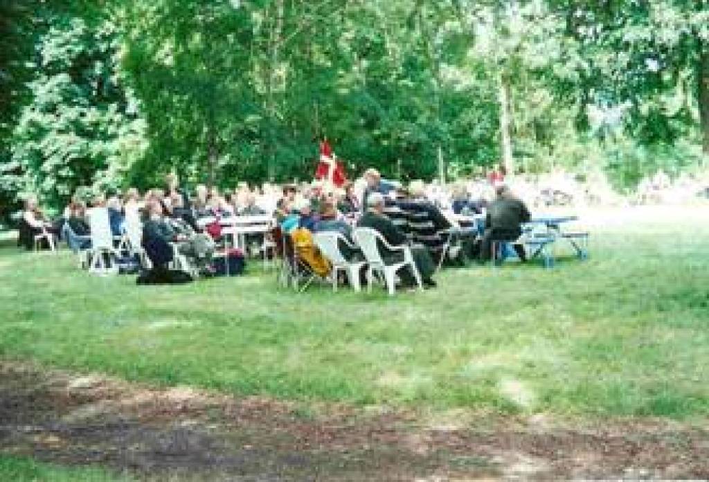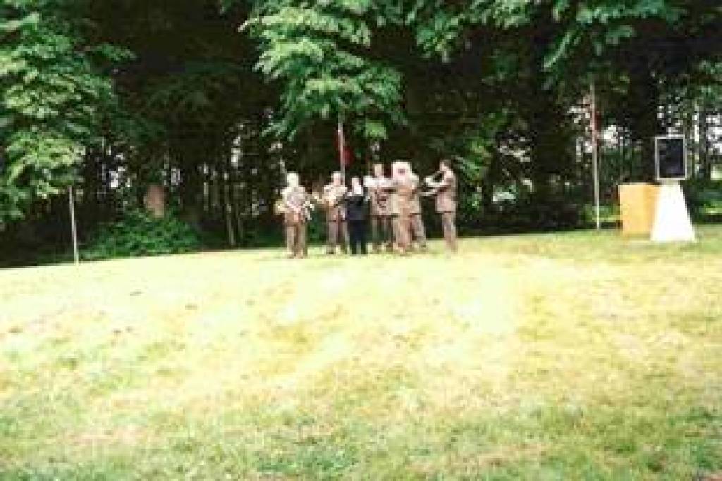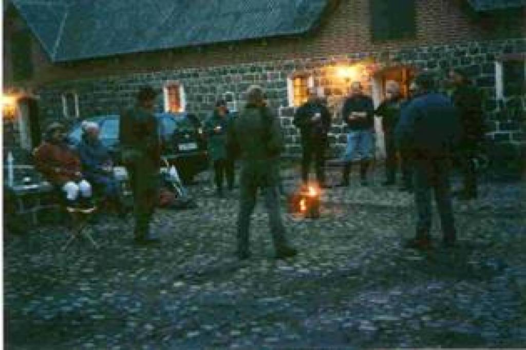 Der er også tradition for, at vi inviteres med til Hyllested Jagtforenings årlige familie-jagtsti, hvor vi så naturligvis giver ”et par numre” til bedste. Her er det fredag den 28. juni 2002, hvor der efter selve turen var hygge-komsammen hos Rasmus Brøgger (medlem både af blæser-gruppen og Hyllested Jagtforening) på ”Skovly” med bål, pølser og snobrød m.v.. – Som det ses af påklædningen, brød der en byge løs under turen, - men det hele sluttede ret så stemningsfuldt.