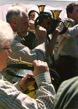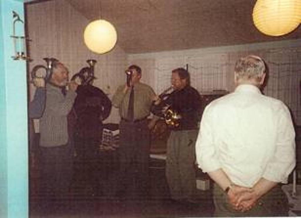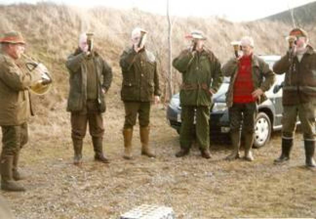 Tilm venstre: Vi "åbner" Elsegaarde Jagtforenings generalforsamling den 15. januar (Jolleklubbens bådehal "Både og"). - Til højre: Som tidligere nævnt, blæser vi naturligvis også på de jagter, vi er med på. – Her er det ”jagt forbi” ved Elsegaarde Jagtforenings rævejagt på Øer, den 26. januar 2003. – Der var ingen ræve på paraden, - men som det ses nederst i billedet til gengæld en (velfortjent ?) kasse øl.