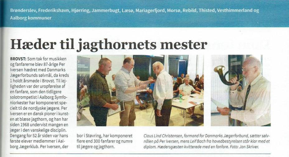 Det fremgår af oktobernummeret af jagtbladet "Jæger", at tidligere leder af Aalborg Jægerklubs jagthornsgruppe - vores egen "gamle lærer" og musikalske leder af vore jagthornsblæser-træf fra 1997-2006, Per Iversen, - ved DJ's kredsmøde i Kreds 1 (Nordjylland) den 21. marts 2020 blev tildelt Danmarks Jægerforbunds sølvnål som anerkendelse af og stor tak for hans indsats for jagthornsblæsningen i Danmark. Per Iversen var som bekendt i en lang årrække solotrompetist ved Aalborg Symfoniorkester, og han har gennem årene komponeret over 300 fanfarer og numre til jagthorn og jægere i Danmark. Heriblandt ikke færre end 12 til os i forbindelse med vores årlige jagt- hornsblæser-træf 1997-2007, hvor han som nævnt var stævnernes musikalske leder.